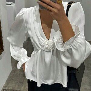 White Casual Women's Solid Color French Style Elegant Loose Fit V-Neck Shirt