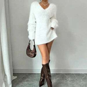White Casual Women's Solid V-Neck Long Sleeve Knit Sweater