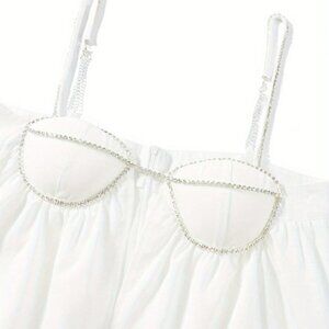 White Casual Women's Spaghetti Strap Rhinestone Cutout Mini A-Line Dress