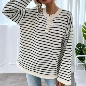 White Casual Womens Striped Drop Shoulder Button Front Sweater