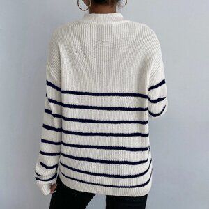 White Casual Womens Striped Drop Shoulder Zipper Front Sweater