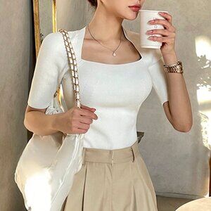 White Casual Women's Tight-Fitting Deformed Square Neck Knitted Top
