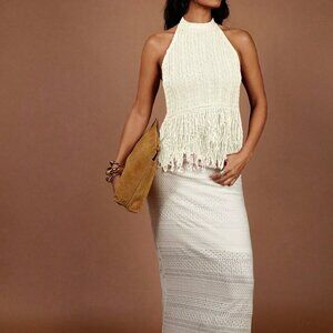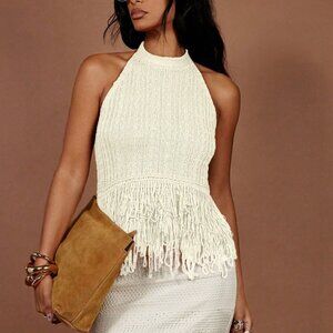 White Casual Women's Vacation Fringe Hem Halter Neck Knit Top