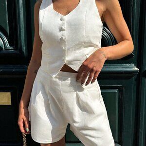 White Casual womens Button Front Vest Jacket & Shorts