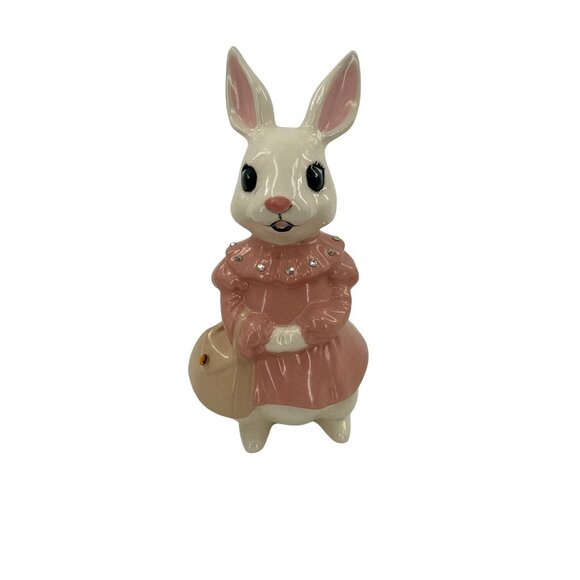 White Ceramic Bunny Anthropomorphic Figurine With Pink Dress Rhinestone Accents