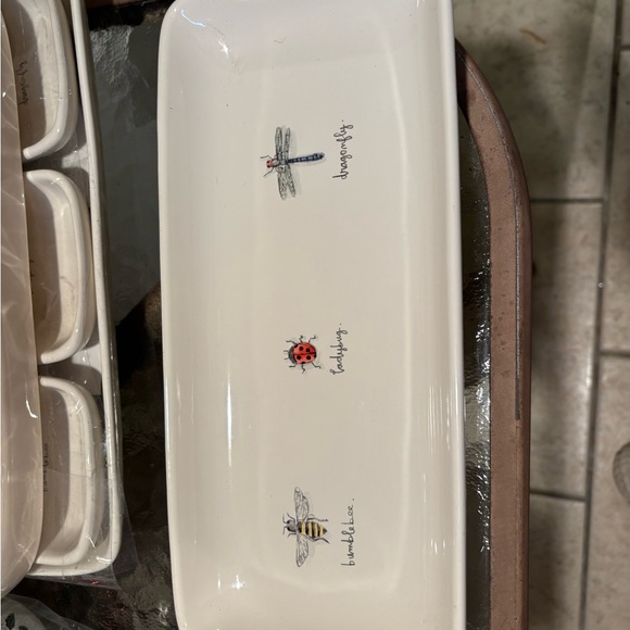 Rae Dunn VHTF Icon Bug Tray and 3 individual Oval plates Charming white ceramic tray featuring dragonfly, ladybug, and bumblebee illustrations. Perfect for serving or decor. These are from 2017/2018 and have never been used and are in excellent condition. I am always open to all reasonable offers.these have been cross listed