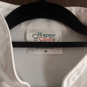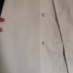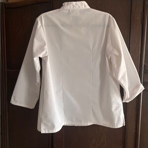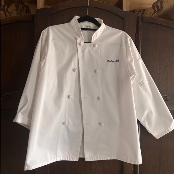 Classic white chef jacket with embroidered 'Pastry Chef' text. Double-breasted design with long sleeves.