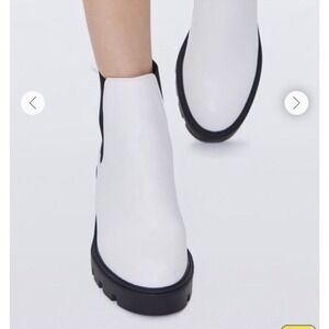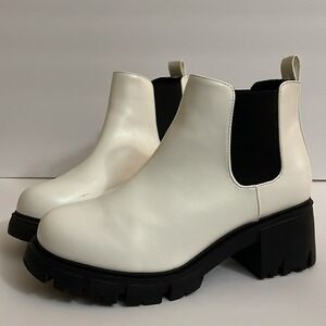 Keywords: Chelsea boots, white booties, platform boots, chunky heel boots, ankle boots, lug sole boots, women's boots, fashion boots, fall boots, winter boots, stylish boots, trendy boots, block heel boots, casual boots