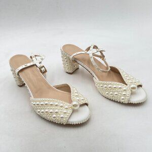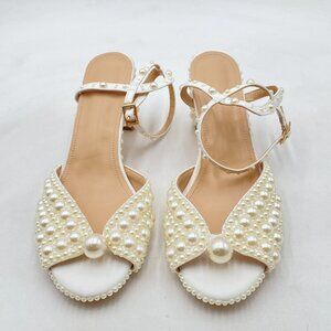 White Chunky Heel Open Toe Elegant Multi-sized Pearls Ankle Strap Sandals Dress