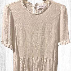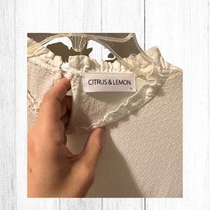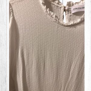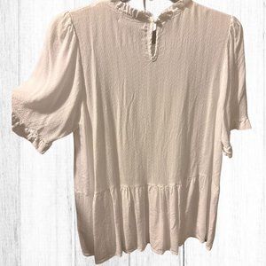 Barely worn. This blouse is very flowy and light! It is a true white blouse * lighting makes it look off. It's the perfect top for Spring and Summer. Ruffle detail on the neckline and sleeves. Keyhole back. Slight peplum bottom.