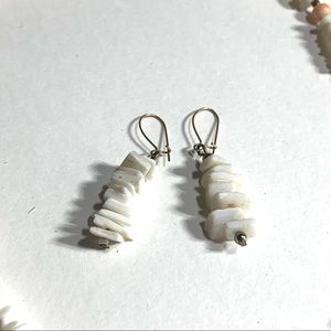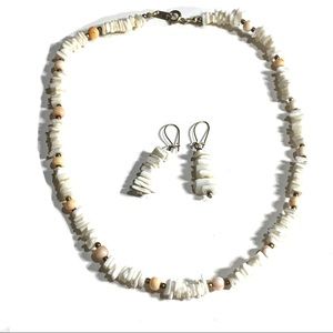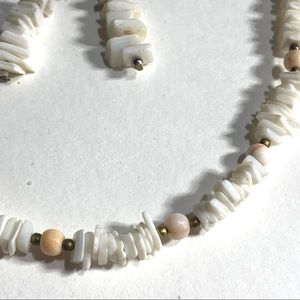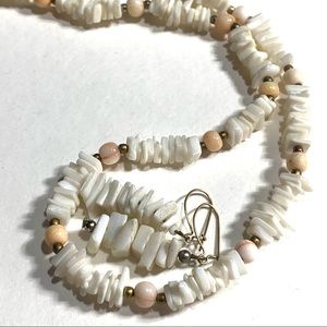 White Clam Shell & Round Light Pink Bead Necklace Earrings Set Boho Chic Beach