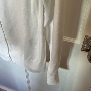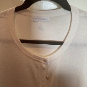 White Classic Cardigan Charter Club, L 80% Rayon, 20% nylon, very soft. Matching buttons. Machine wash cold, reshape flat ( I would hang dry, carefully)