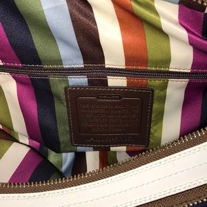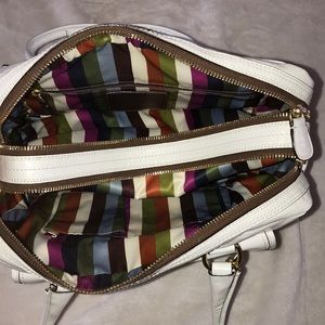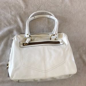 White leather Coach purse with gold hardware. Three front pockets with on zipper pocket in the back and two compartments in the middle.