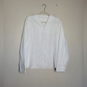 Very classy and sophisticated white blouse. Collarless neckline with a dainty lace trim and pearl buttons. The trim and buttons are also on the cuffs. Crisp white color. No size, brand or material tag. Measures like a large. Approximately 27 inches long 21 inches underarm to underarm laid flat.