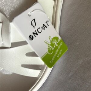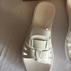 These white sandals boast a contemporary design with a wide H-shaped strap, offering a sleek and minimalist look. Made from a smooth material, they are perfect for casual summer outings. The flat sole ensures comfort and ease for everyday wear.