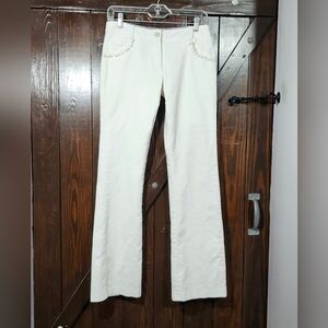 Stylish designer Matthew Williamson white corduroy pants featuring unique pom pom trim on each front and back pockets. back patch is leather with cool peacock beaded embroidered feather. low rise straight leg and extremely soft fabric.