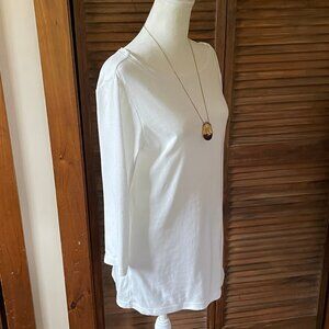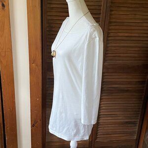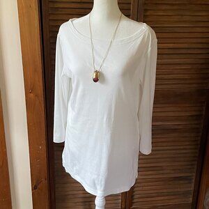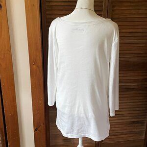 This lovely, versatile 3/4 sleeve white shirt could become a wardrobe staple. The two-button accent is on the left-side shoulder only. 100% cotton. Size: Large. It began as New With Tags (NWT) but encountered a dust smudge while in storage, so the tags were removed and it was washed (unscented). It has never been worn. I do not know how that translates to NWOT or NWT, if either.
