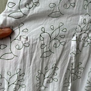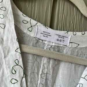 Breezy and lightweight, this elegant white cotton maxi dress features a handprinted vine design in forest green and a flattering cinched waist detail. Crafted from soft 100% cotton, it drapes beautifully and keeps you cool in warmer temps. The relaxed fit, short cap sleeves, and flowing silhouette make it ideal for lounging, beach vacations, or styling with sandals and a sun hat for effortless summer chic.