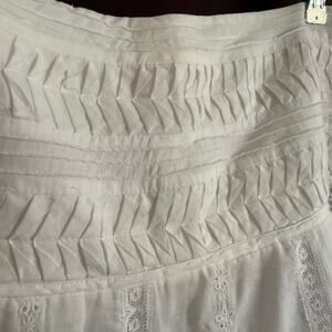 White Cotton and Lace A Line Midi Skirt with Pleated Waistband 100% Cotton Lace Insets Pleated Waistband High Waisted Knee Length Tags have been removed, otherwise, excellent condition Women's Size Medium Lay-flat measurements: Waist: 15 inches Length: 26 inches Boho, Bohemian, Beachy, Coastal, Bridal, Bachelorette, Bride, little white skirt, White Skirt,