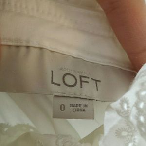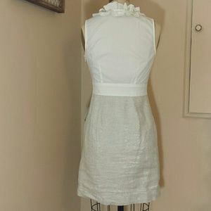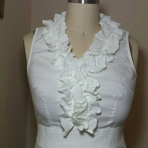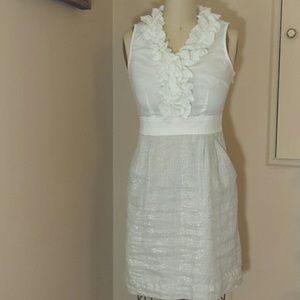 This beautiful dress is from Ann Taylor Loft. It features a white v neck bodice with an eyelet lace ruffle and a linen skirt with silver metallic threads.
