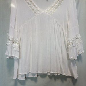 White Crepe Asymmetrical Embroidered Fluttery Top. It has V-neckline trimmed with open crosshatch embroidered designs. The bodice flares out in an A-line giving lots of room. Sleeves are 3/4 length and fluttery. They are trimmed in white embroidery.