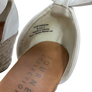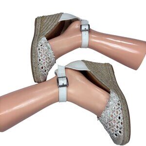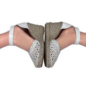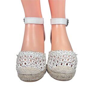 White Crochet Espadrille Wedge Sandals With Ankle Strap & Buckle Closure
