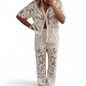 Effortlessly chic and made to turn heads, this pants Set features an airy, floral crochet design that’s perfect for vacation, brunch, or a beachside stroll.