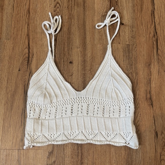 Size: S/M, Brand: boohoo, Good condition. White crochet/ knit tank top with adjustable tie straps and somewhat low back.