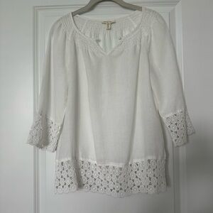 Elegant linen white top with delicate crochet lace trim. Perfect for any occasion.