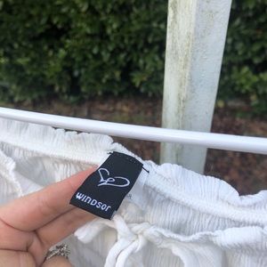 Cute 3/4 sleeve white crop top from Windsor. This top has an elastic bottom and and off-the-shoulder fit. It would be a great staple in your 70s, prairie, or boho wardrobe!