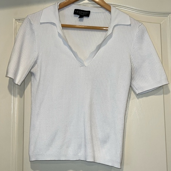 White ribbed material, longer ss style, v-neck with scalloped edge, super cute!