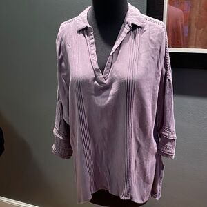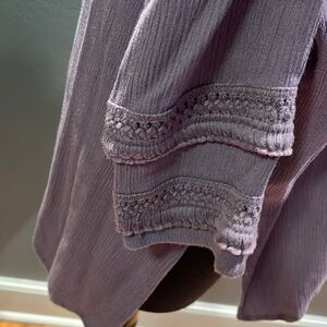 White Crow lavender crinkle gauze crochet shoulder tuxedo pleat front top. Split front neckline with pointed collar. Curved hem with deep sideseam slits. Sleeve with heavy weave accents. Small. Soft 100% rayon. Excellent condition. Nonsmoking home.