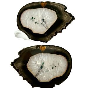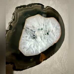 This stunning polished agate slice features a glowing white crystallized center with unique green inclusions, framed by a wavy dark brown and amber edge. The natural shape and glassy finish make it ideal for crystal collectors, display setups, or artistic spaces. Measures approx. 4.25” x 2.75”. Truly a one-of-a-kind piece.