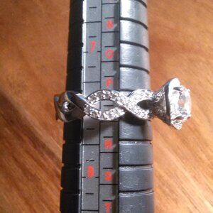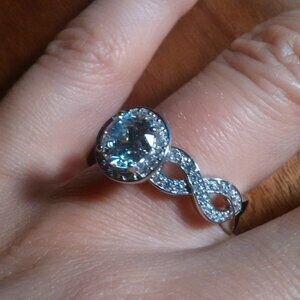 This beautiful ring has a central white cubic zirconia stone with smaller accenting zirconia stones on the band. The ring is set in platinum over 925 sterling silver and is size 8. Brand new.