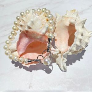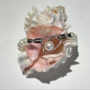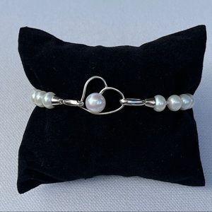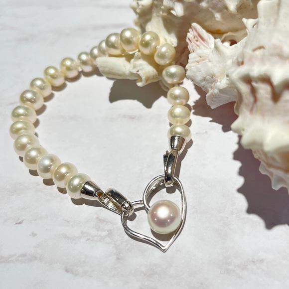 White Cultured Freshwater Pearl Bracelet W/ 925S Heart Shaped Pendant Clasp 7.5"