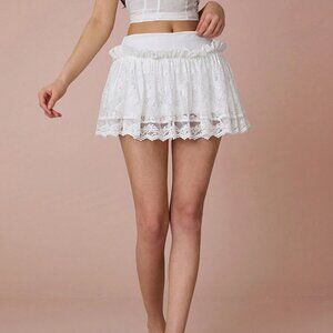 This cute mini skirt features a white floral lace design, offering a casual and feminine look. It has a regular fit, a short length, and a flared, layered/tiered style for a playful touch.