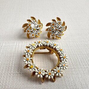 This 1950s daisy brooch and earring set features white enamel flowers with sunny yellow centers and textured gold-tone leaves. The brooch measures 1 ¼ inches in diameter, and the clip-on earrings are ⅞ inches. A charming mid-century floral set perfect for collectors or gifting.
