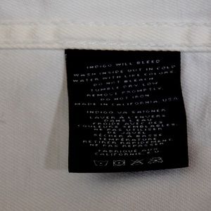 A J Brand white denim jean jacket with distressed accents.