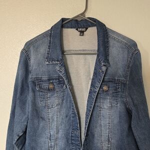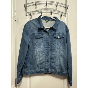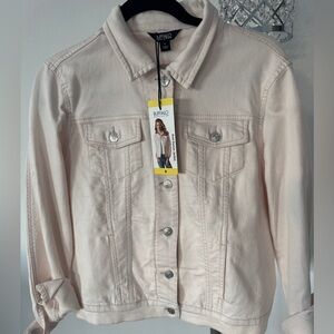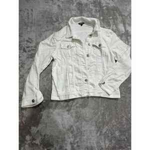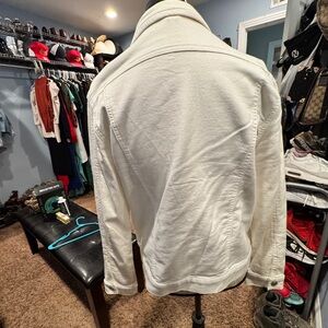 Stylish white denim jacket with button closure. Features front pockets and a classic collar. Like new. Worn once. Cleaning out my closet. More jackets to come!