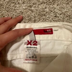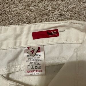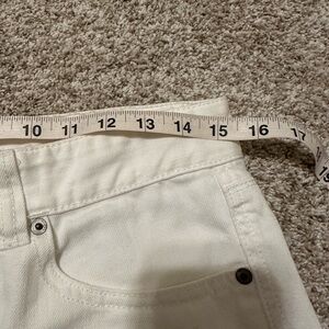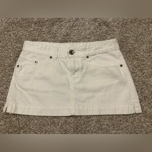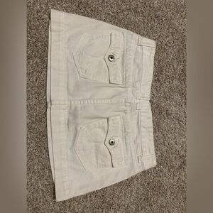 Stylish white denim mini skirt. Features front pockets and button closure. Perfect for casual outings.