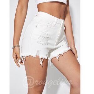 White Denim Shorts Distressed Ripped High Waist Raw Hem