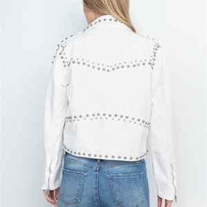 Long sleeve collared neckline zip overlap front embellished denim jacket.