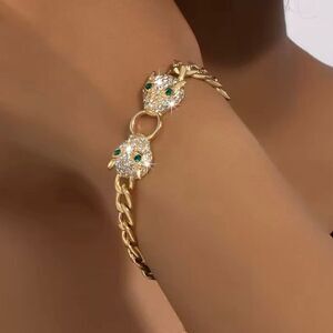 White Diamond Simulated Green Emerald Glass Leopard Head Link Gold Bracelet New