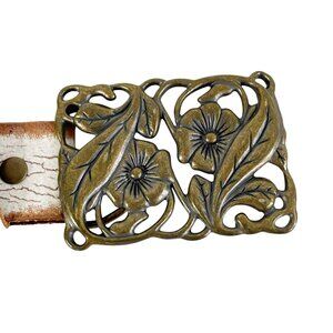 White Distressed Leather Belt with Boho Brass Floral Buckle by Goorin, Size M/L