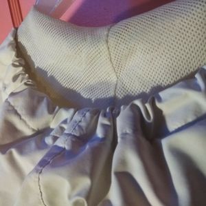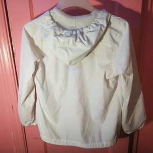 It is a worn white jacket that is very thin. It is something I would wear during fall. It has a silver zipper down the middle and two pockets with silver zippers.