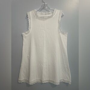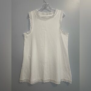 Beautiful solid white dress (unbranded) with scalloped edges around neckline, bottom hem, and arms. Sleeveless. Rounded neckline. Made of 100% cotton. Lightweight and slightly sheer. This dress ha a tag that lists it as a 2X, but the measurements imply this is more of an XL (or even a large, depending on how you like the fit). So check out measurements below to decide if this is your style! Great for the beach or even as a swim coverup!