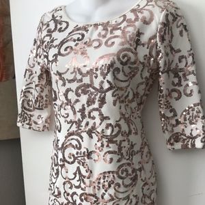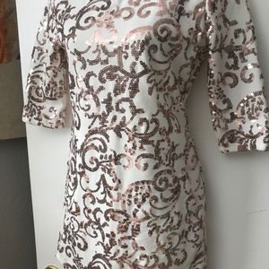 Never Been Worn Stretchy White Dress with Ivy like Rose Gold Sequine Pattern