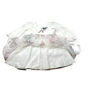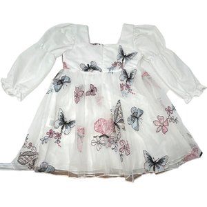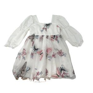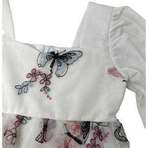 This White Dress with a square sweetheart neckline is adorned with embroidered pink & blue butterflies & flowers accented in black & silver. Features long puffy sleeves with elastic just above the elbow. It has a high waist and a mesh overskirt. This Dress is in Excellent preowned condition - Like New. The Brand is Shein. European Size 116 - US Size 6