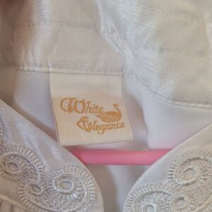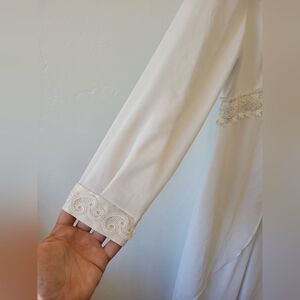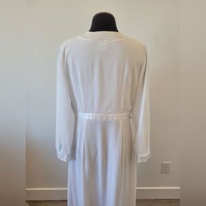 Gorgeous white dress in a maxi length. Front zipper closure. Full length sleeves and flattering skirt layers. Embroidery details at the waist and collar. All white, clean, no stains. Size medium measures approximately 54 inches long 19 inches underarm to underarm laid flat 32 inch waist.