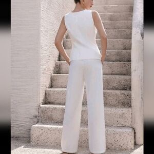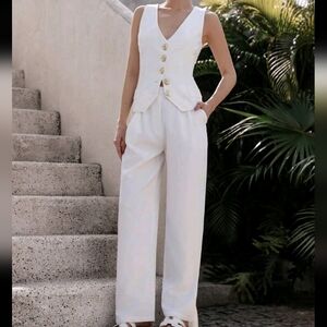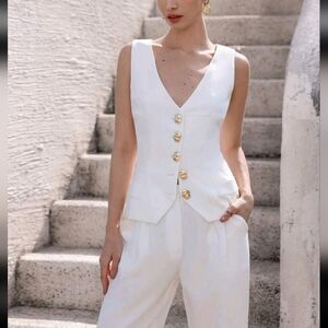 White Elegant Design V-Neck Single-Breasted Vest + Pants Women Suit Set